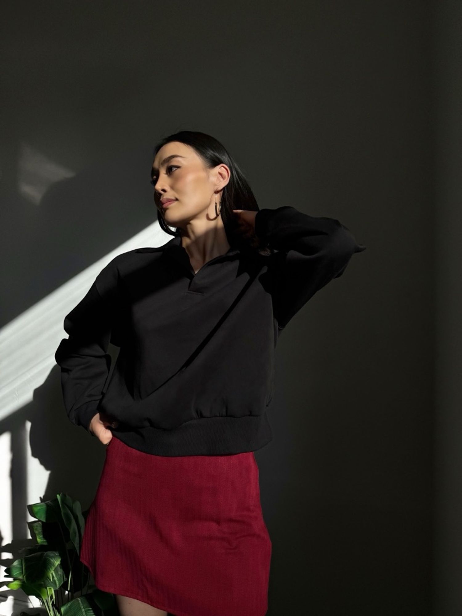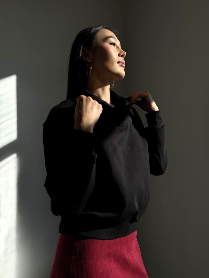 Black polo shirt-oversized Маш хөнгөн материалтай, төрөл бүрийн хувцсан дээр давхарлаж өмсөх боломжтой. Бүх төрлийн хувцаслалтан дээр тохирно. Модель: 176:60, L size өмссөн.