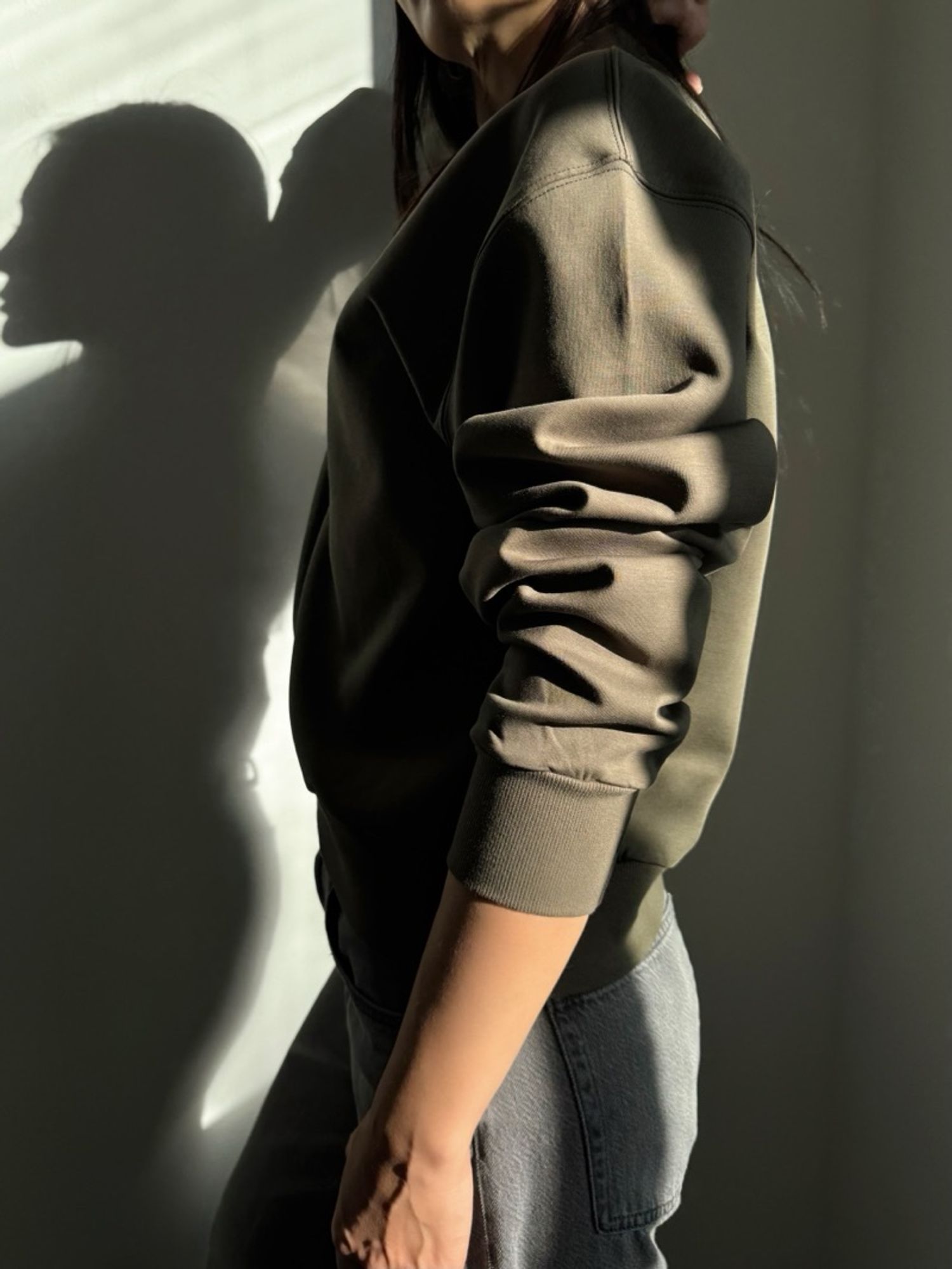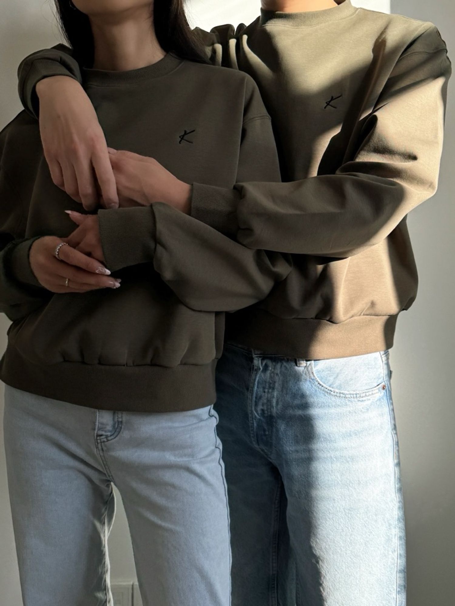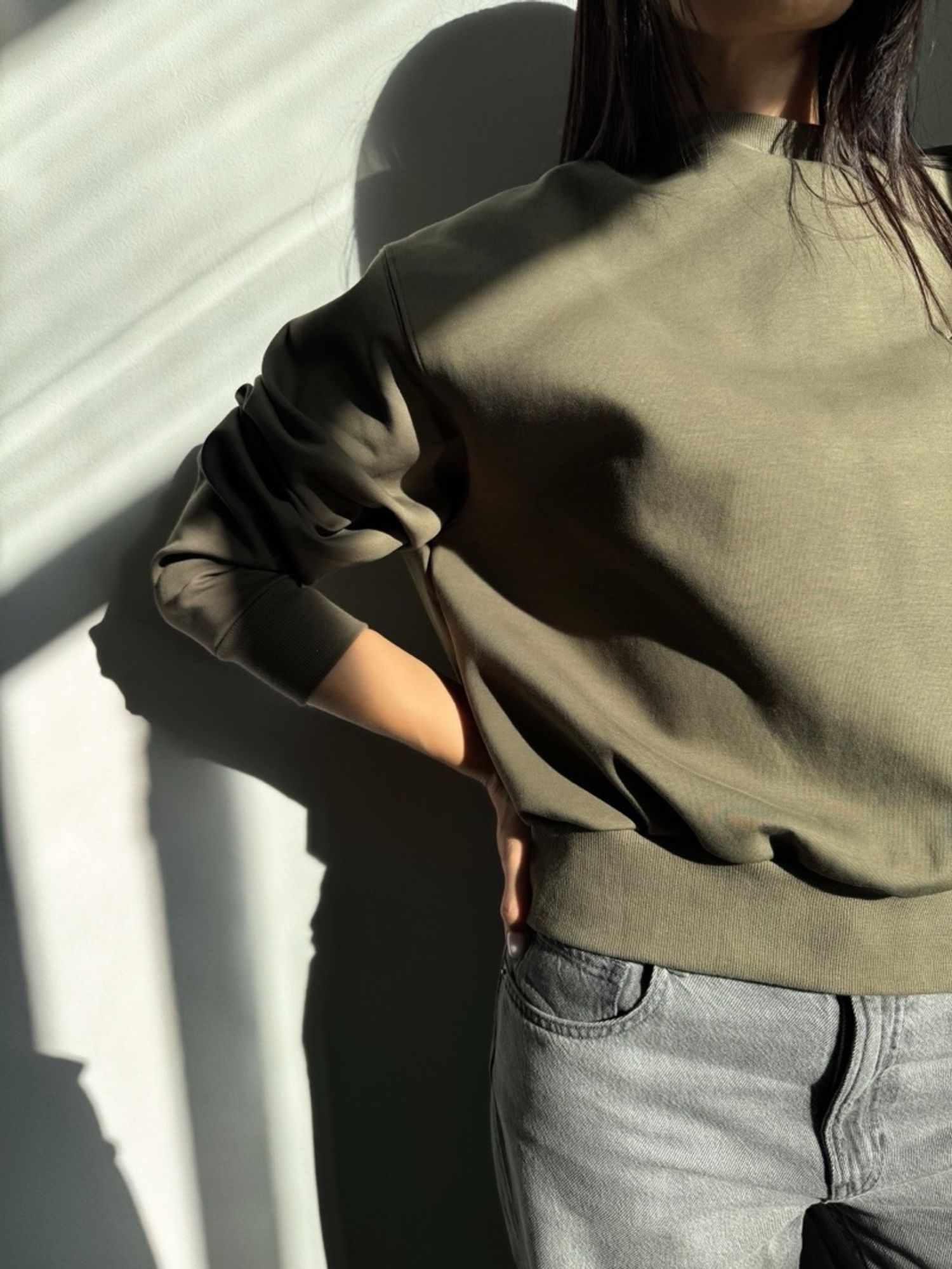 Olive green sweatshirt-oversized Маш хөнгөн материалтай, төрөл бүрийн хувцсан дээр давхарлаж өмсөх боломжтой. Гоё загварлаг харагдах өнгөтэй. Модель: 176:60, L size өмссөн.