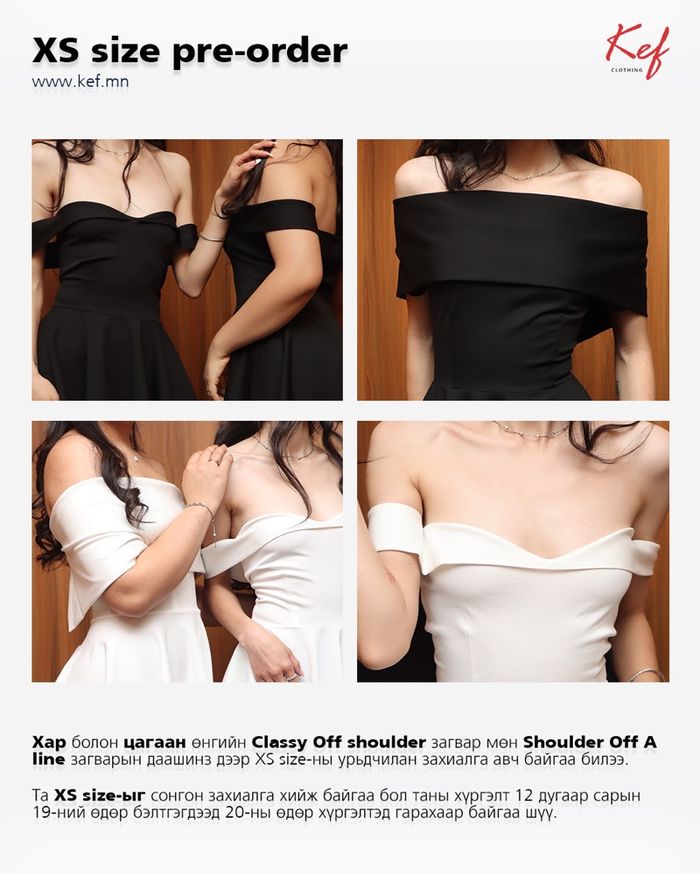 Shoulder off A line midi dress- хар Материал: Суналттай даавуун материалтай Өмсгөл: Бэлхүүс хэсгээрээ бага зэрэг бариу ба А хэлбэрийн хормой нь галбирыг тэнцвэртэй бөгөөд бэлхүүсийг нарийн харагдуулна. Хүргэлтээр авах бол хөхний даруулгын размераа ашиглан size chart-аас тохирох хэмжээгээ сонгоорой. Хэрэв боломжтой бол дэлгүүр дээр ирж өмсөж үзээд өөртөө тохирох хамгийн зөв хэмжээг сонгохыг зөвлөж байна.