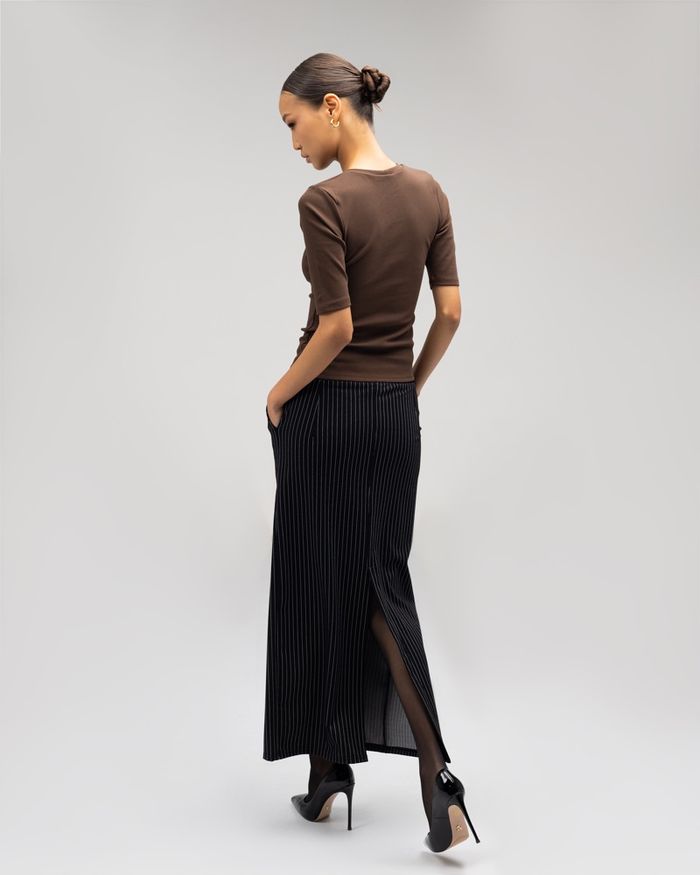 Шулуун зураастай урт юбка. Намрын өдөр эсвэл сэрүүхэн улиралд өмсөхөд тохиромжтой, ямар ч хэв маягт уусдаг timeless загвар. Шулуун судал нь хөлийг урт, биеийг улам нарийхан, эмэгтэйлэг харагдуулж өгдөг.